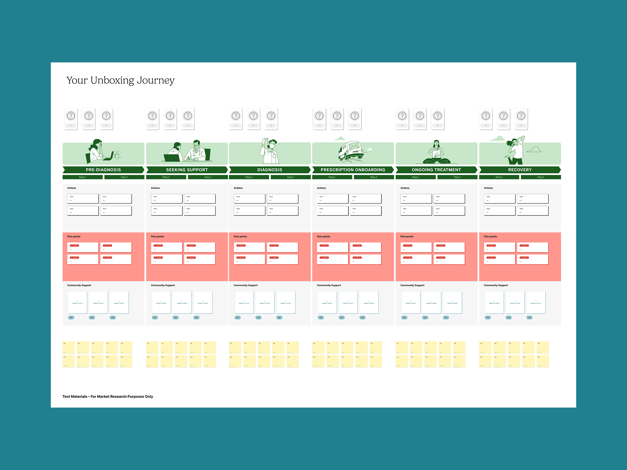 Observe how patients interact with delivered medications, identifying friction points, unmet needs, and emotional highs and lows during unboxing and first use.